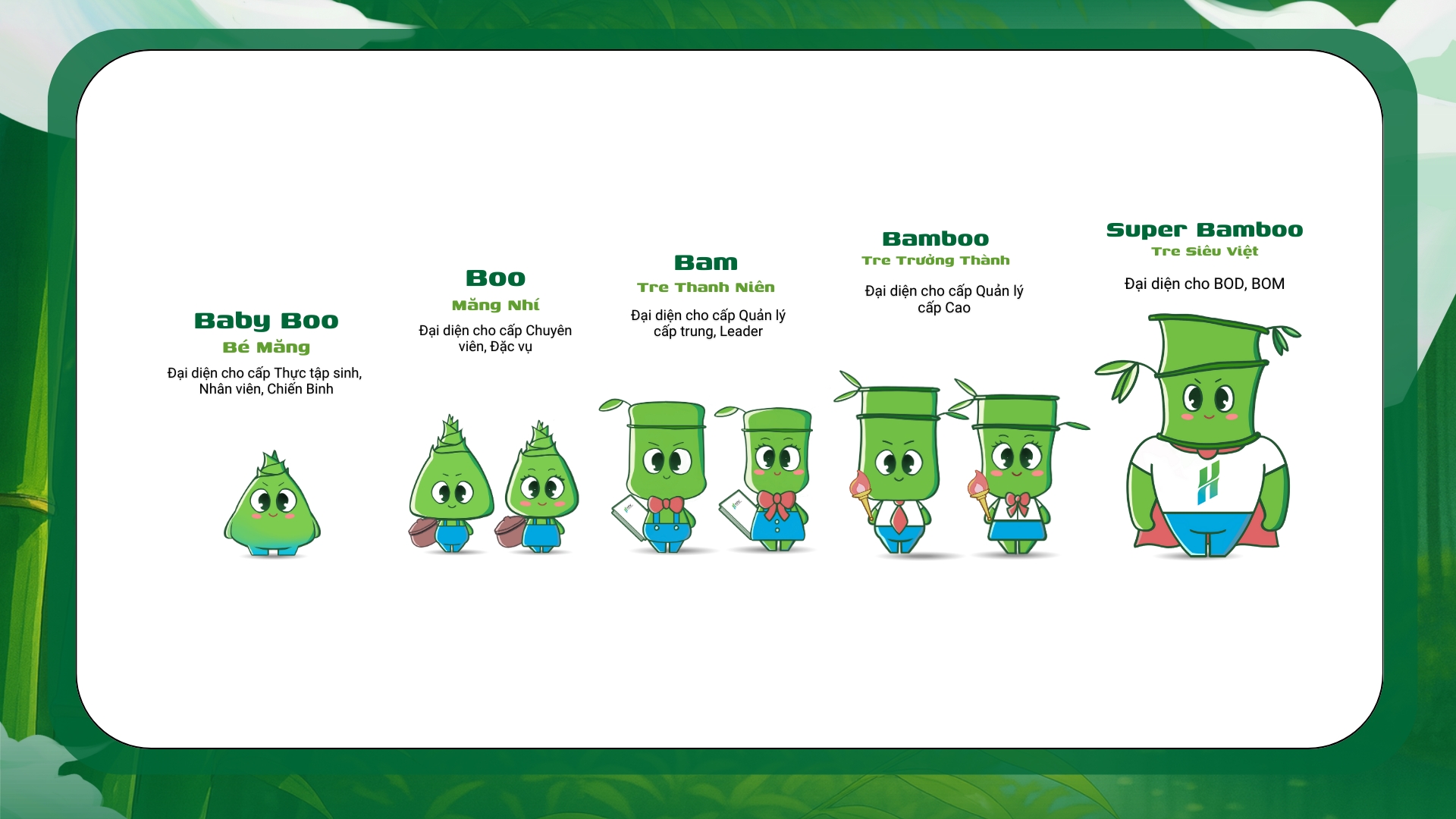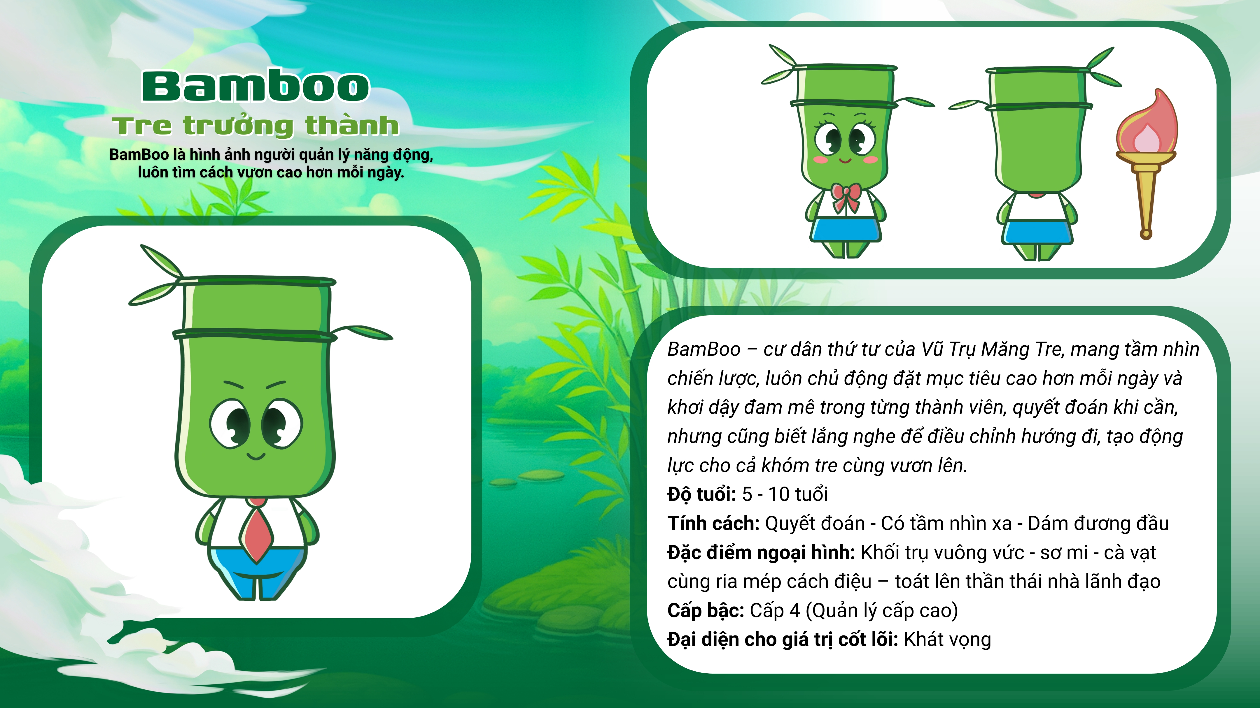 Bamboo – Tre Trưởng Thành mang tầm vóc của một nhà quản lý cấp cao. Bamboo là biểu tượng của khát vọng, của tinh thần dám đặt ra những mục tiêu lớn và khơi dậy ngọn lửa đam mê trong mỗi thành viên, đồng thời biết lắng nghe để điều chỉnh, dẫn dắt cả khóm tre cùng vươn lên.