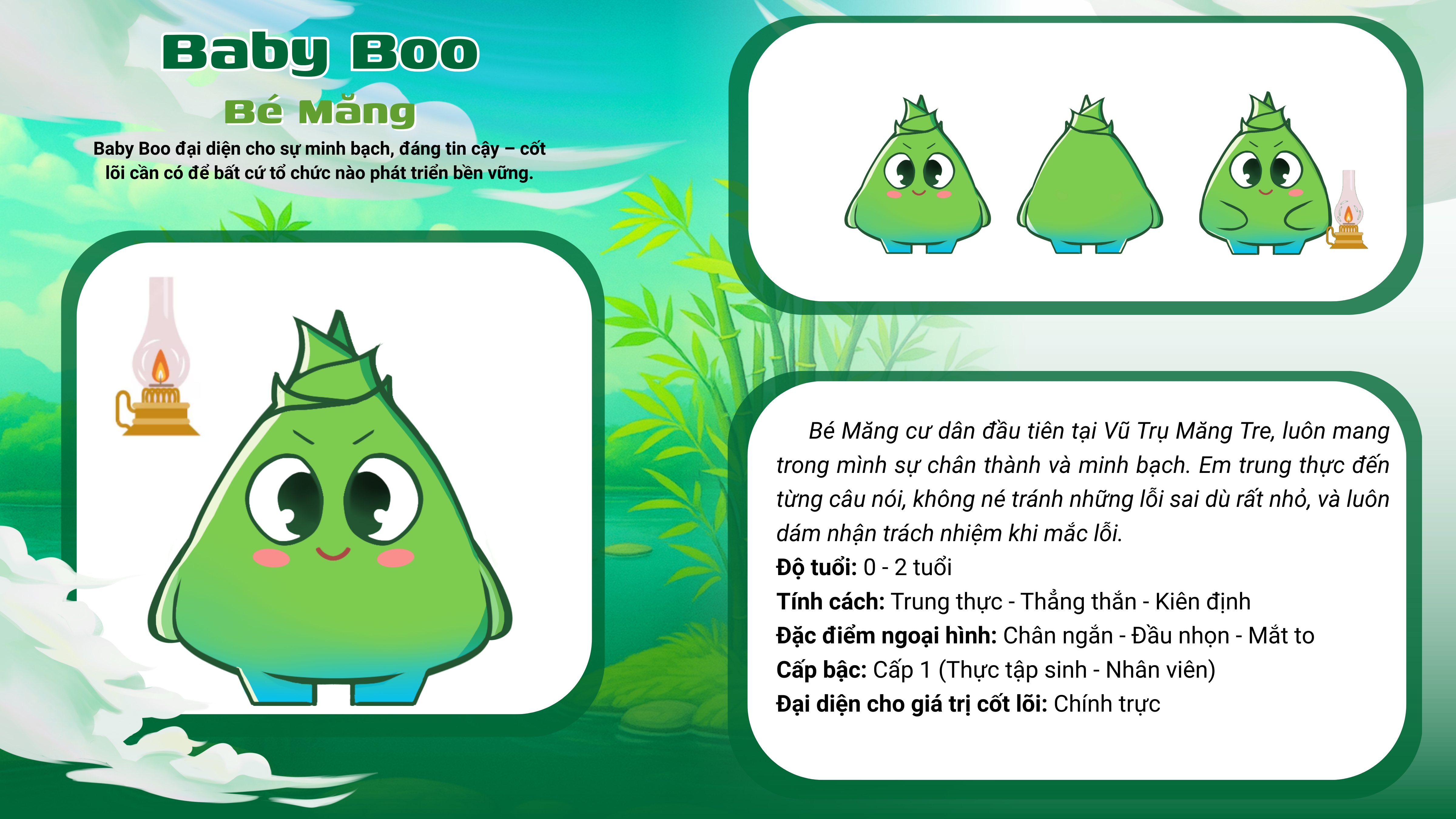 Baby Boo – Bé Măng là cư dân đầu tiên, hiện thân của sự trong sáng, chính trực và minh bạch. Em là hình ảnh của thực tập sinh, nhân viên mới – dẫu còn non nớt nhưng luôn dám nói sự thật, dám nhận trách nhiệm để vững vàng bước tiếp.