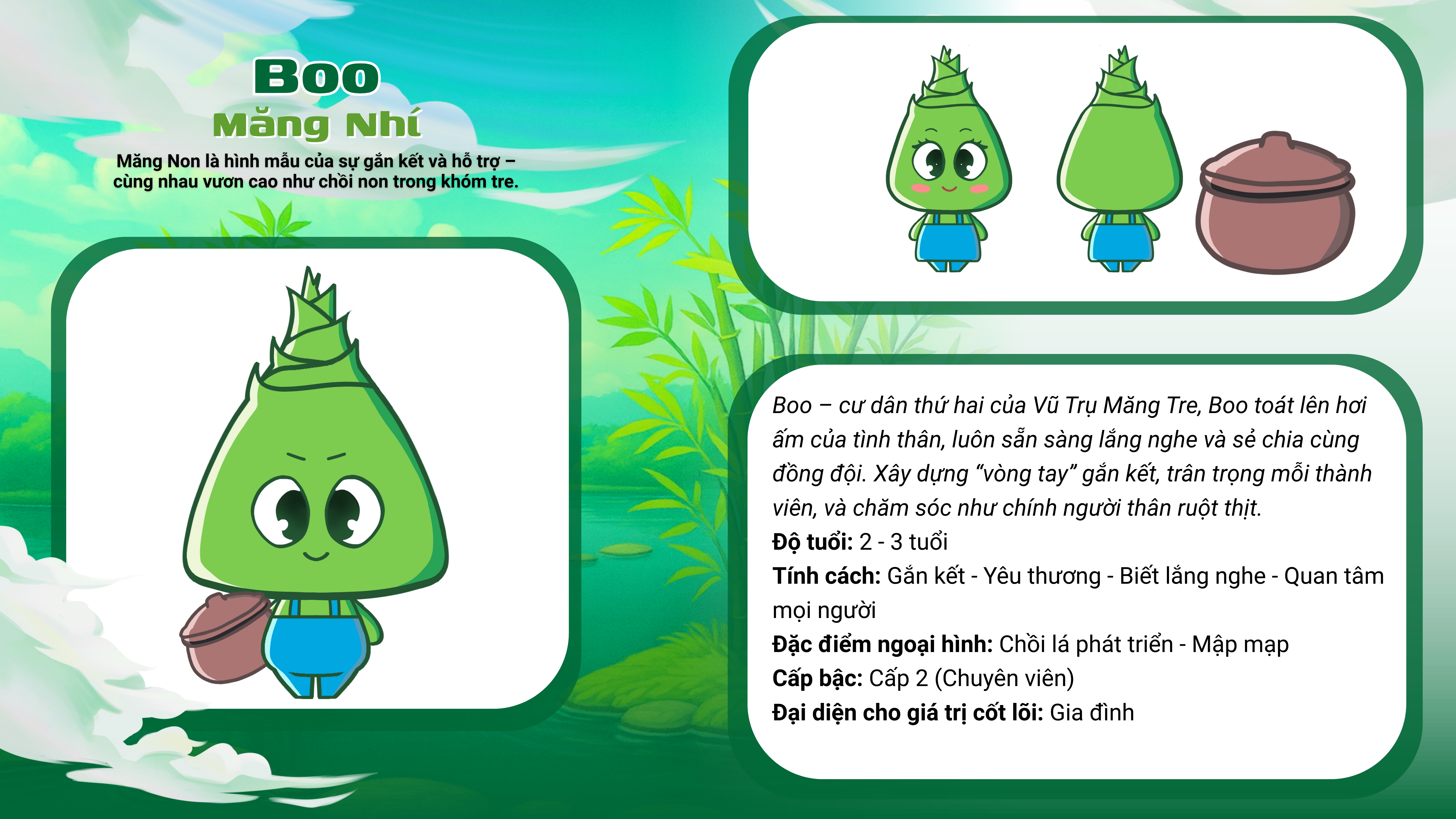 Boo – Măng Nhí, biểu tượng của sự gắn kết và tình thân, luôn sẵn sàng lắng nghe, sẻ chia và cùng đồng đội vun đắp vòng tay đoàn kết như những chồi non quấn quýt trong khóm tre. Khi trưởng thành hơn.