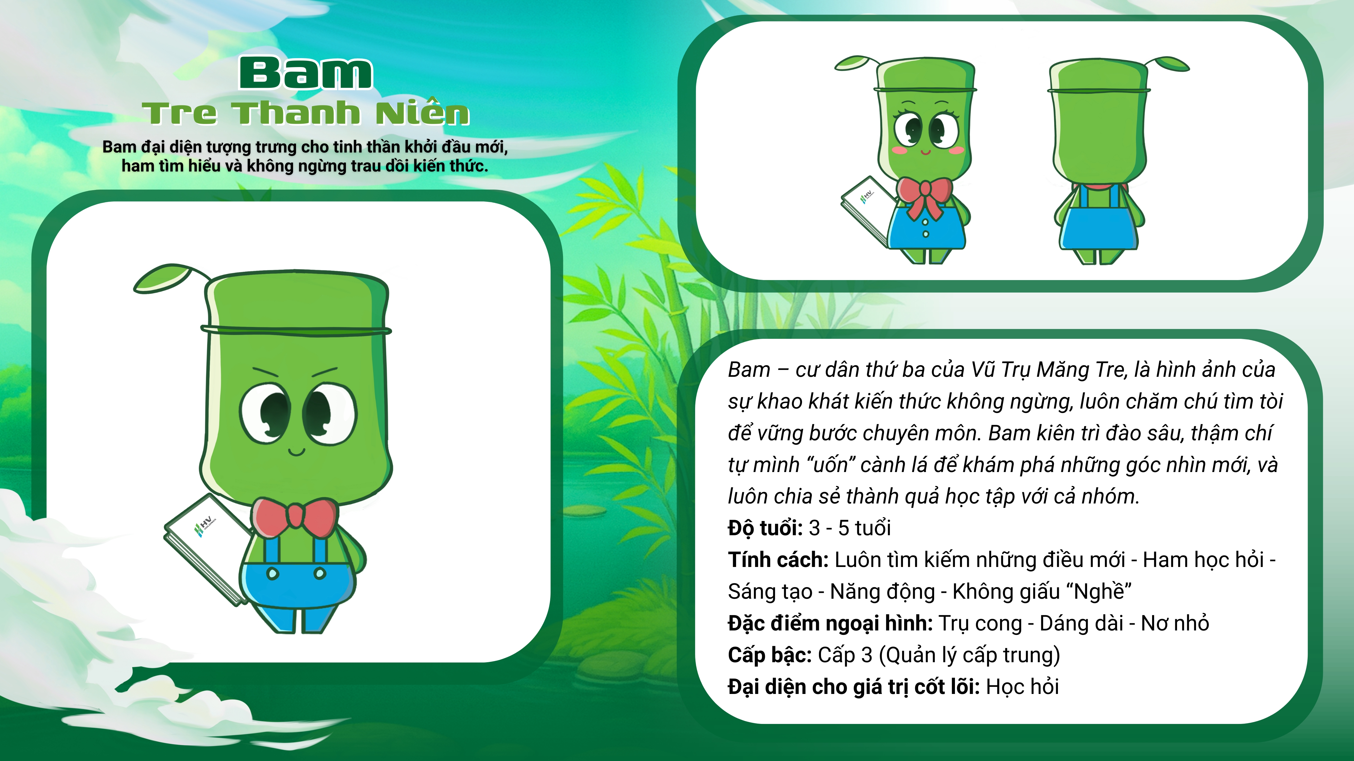 Bam – Tre Thanh Niên xuất hiện với tinh thần ham học hỏi, khát khao tri thức và không ngừng sáng tạo. Bam chính là hình ảnh của những người quản lý cấp trung, những người ngày ngày kiên trì đào sâu chuyên môn và truyền cảm hứng học tập cho tập thể.