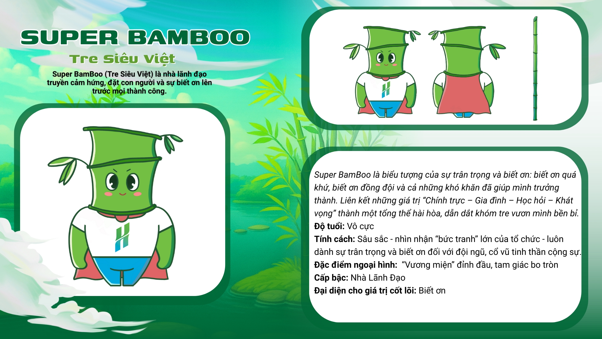Super Bamboo – Tre Siêu Việt chính là bản hợp thể của những cư ấy và đây cũng là biểu tượng của sự biết ơn. Đại diện cho đội ngũ lãnh đạo BOD, BOM, Super Bamboo không chỉ truyền cảm hứng mà còn nhắc nhở tập thể trân trọng quá khứ, tri ân đồng đội, coi mọi khó khăn là nền móng cho thành công, và từ đó bền bỉ vươn ra thế giới.
